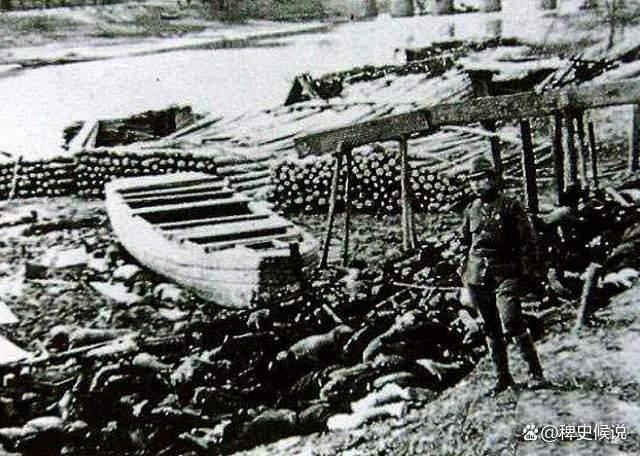 在码头上,一片黑黝黝的尸体堆垒如山,在尸山里蠕动着人影,总有50人乃至100人以上,转来转去拖曳着尸体丢向江流里去。他们不声不响地忙个不停,就像在演哑剧。