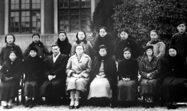 金陵女子文理学院难民营工作人员合影。(左四为魏特琳,左五为程瑞芳)