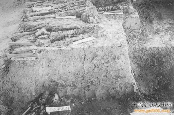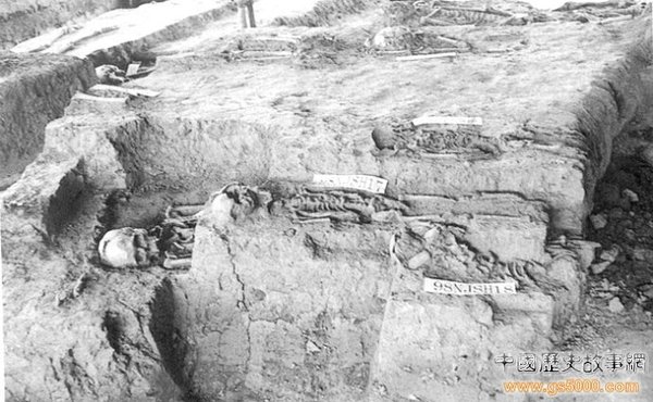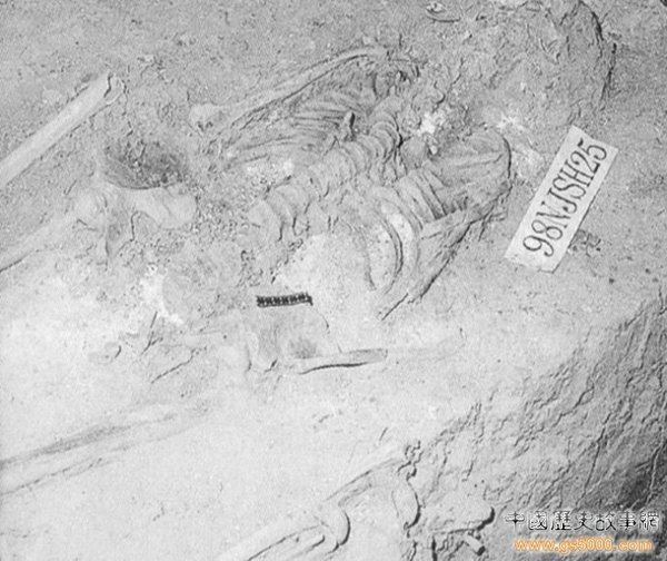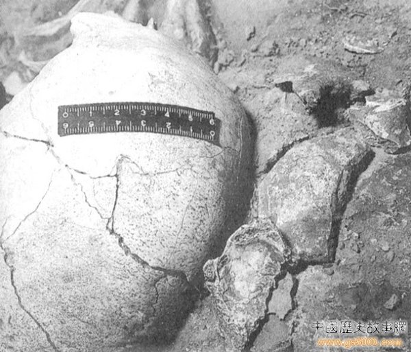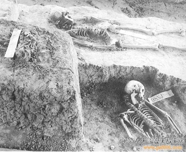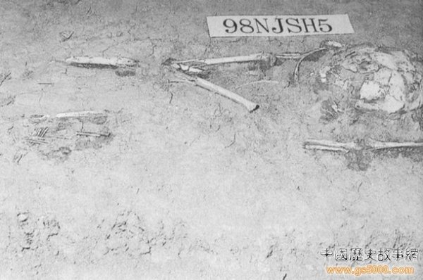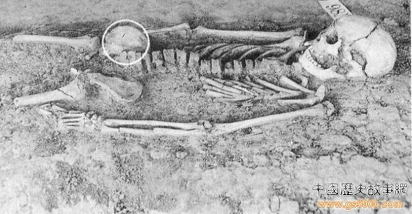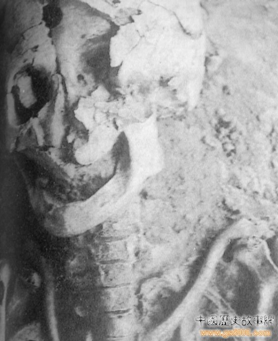 图为一具6岁儿童骸骨。其头骨置于胸肋之下、下颌及部分肋骨散布于头骨周围,估计掩埋前已头颈分离