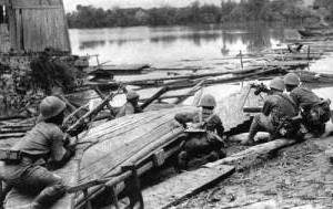 △1937年12月13日,侵华日军第六师团在秦淮河上搭建木桥突入南京中华西门