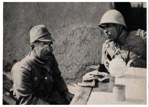 △第一一四师团长末松茂治(右)与第六师团长谷寿夫商讨会攻中华门