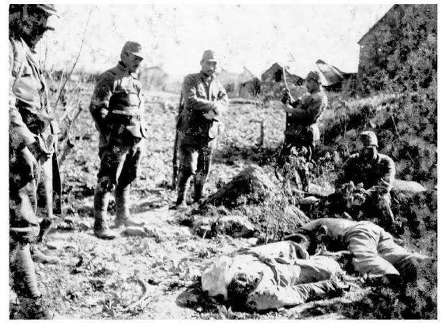 还有屠杀不久的场面,日军站在周围,被杀者身着军服,剃了光头。在城墙一角集体屠杀的场景,尸体也是双手被反绑。作为侵华日军南京大屠杀现场照片,具有重要的史料价值。