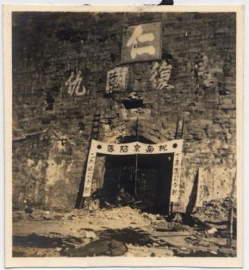 相册中日军在南京中华门悬挂“祝南京陷落”等标语的照片。 受访单位供图