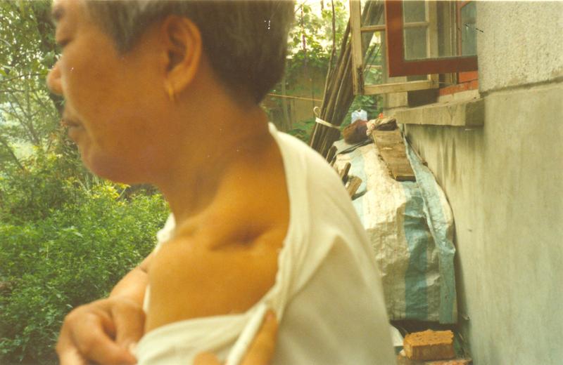 我可怜的母亲听到枪声,赶忙跑过来,想抱住父亲。日本兵又一枪打死了母亲,可怜我母亲一声未喊出来就死了。我当时只有11 岁,跑出来,看到父母亲倒在地上,日本兵又向我开枪射击,打中了我的肩胛骨,到现在我的肩胛骨上还看见子弹的伤痕。我浑身流血,倒在地上昏迷不醒。